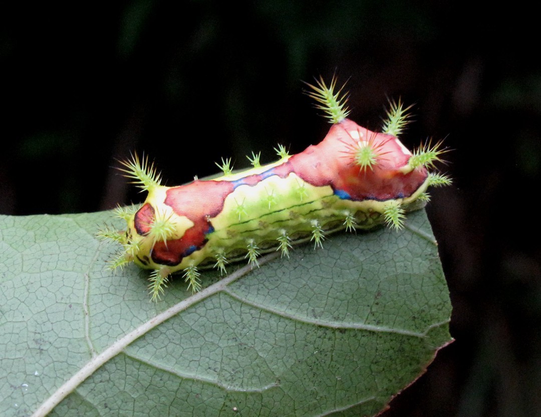玉带斑蛾幼虫(斑蛾科),常在白檀的叶片上出现,色彩过分鲜艳的虫子都是惹不起的主儿,它们会喷射毒液出来,非常可怕。