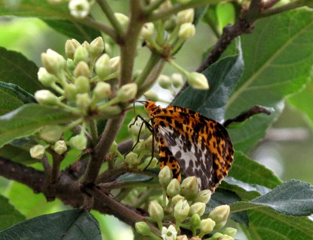 大斑豹纹尺蛾(尺蛾科),像蝴蝶一样爱在白天活动,这只正在猫乳的花朵中采蜜,白天出来活动的蛾子多数色彩比较华丽,是蝶类的竞争对手。