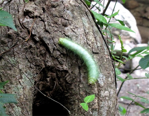 银杏大蚕蛾的老熟幼虫(大蚕蛾科),幼虫食性广泛,尤其喜欢吃枫杨树的叶片,化蛹前会离开寄主植物,找个它认为安全合适的地方作茧,每年在深秋时节羽化,然后交尾产卵死亡,以卵的方式来越冬。