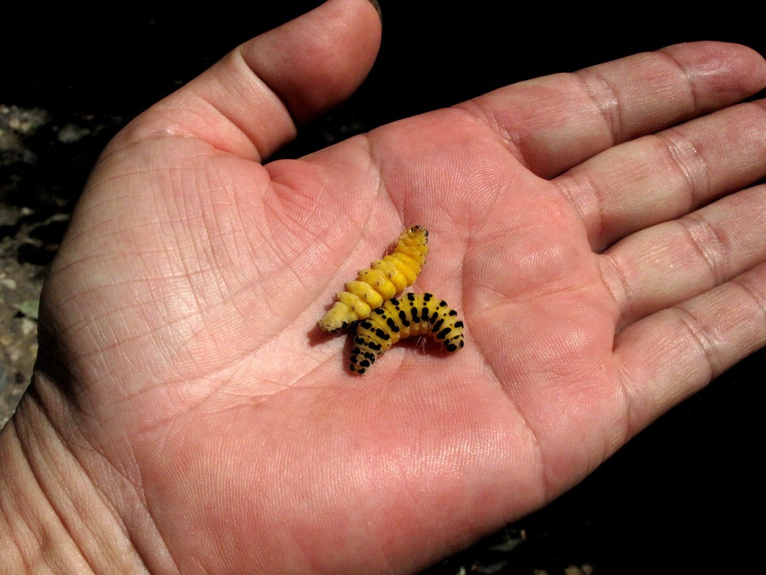 臭椿夜蛾的化蛹前幼虫,身上的毛茸已经脱落,离化蛹只有一步之遥,它们是从已经作好茧中被弄出来的