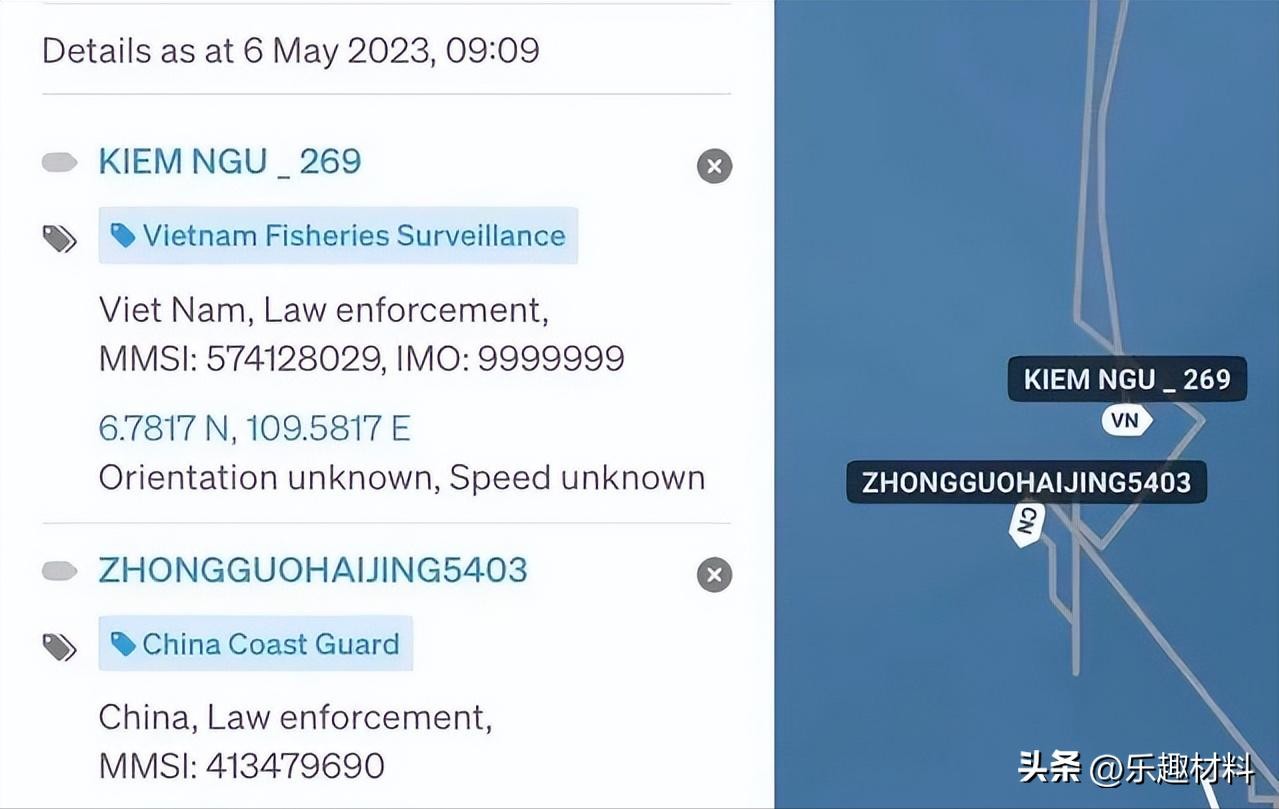 2023年5月6日,时隔1个多月,我国海警5403号舰前往万安滩对越南高脚平台进行拍照取证,遭到越南KN-269号渔政执法船的阻挠,两船发生长时间对峙。