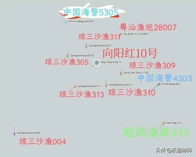 根据最近更新的航海数据网站信息,隶属于三沙市的大型渔船(琼三沙渔004,305,309,310,311)和“向阳红10”号大型科考船也已经进入了越南单方面划定,并且不被国际法所承认的南海海域专属经济区(EEZ)。