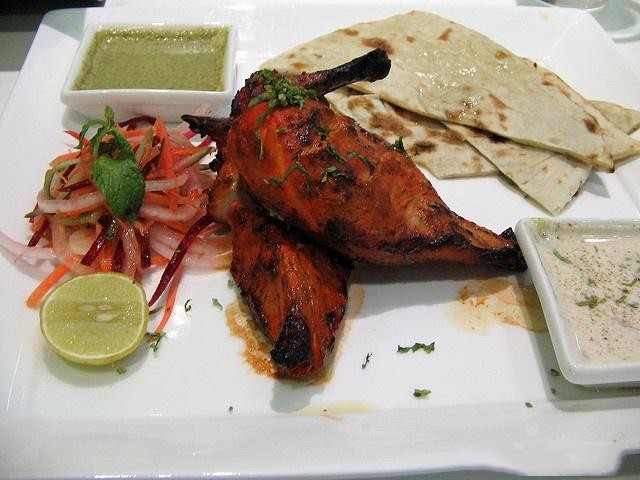 烤鸡:坦度里鸡:一种很受欢迎的北印度菜肴,由烤鸡配酸奶和香料烹制而成。它的名字来源于一种圆柱形的陶土烤炉,这种烤炉是一种传统的烹饪方法。鸡肉浸泡在酸奶中,用香料混合物tandoori masala调味。辣椒粉、红辣椒粉或克什米尔红辣椒粉被用来给辣椒增添火红的色彩。这道菜与蒸巴斯马蒂香米和酥脆的馕饼搭配得非常好。
