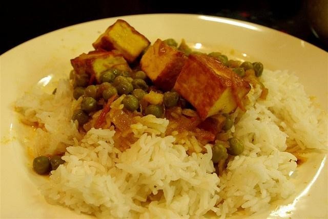 豌豆奶豆腐:玛塔·帕尼尔是一种素食的北印度菜,由豌豆和农民奶酪(帕尼尔)组成,以番茄为基础的酱汁,并与garam masala调味。它通常与米饭、馕饼、帕拉莎饼、poori或roti(取决于地区)一起食用。大多数爱吃这道菜的人都推荐在美味的番茄酱中蘸上面包。