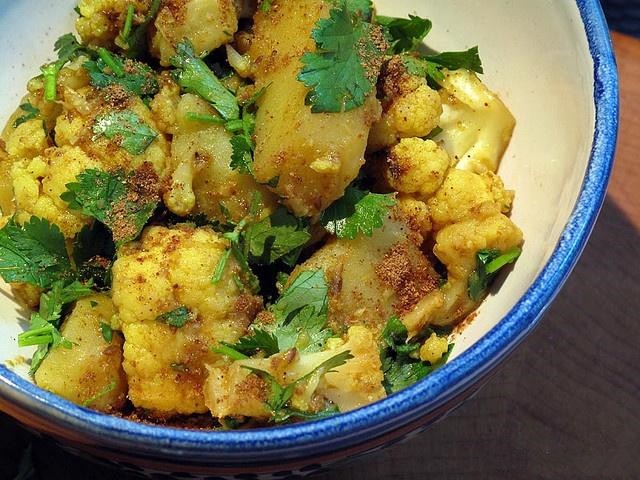 ALU GOBI:这是一种用土豆(芦荟)、花椰菜(戈壁)和印度香料做成的干菜。它是黄色的,由于使用姜黄,并偶尔包含kalonji和咖喱叶。其他常见的配料包括大蒜、姜、洋葱、香菜茎、西红柿、豌豆和孜然。这些加起来是印度餐馆里最受欢迎的菜肴之一。