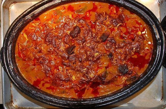 牛肉咖喱肉:Vindaloo本身是一种咖喱菜,在果阿地区很受欢迎。作为咖喱屋(curry house)菜单上的主食,它以英印两国风味闻名于世。咖喱屋通常被视为一种辛辣的菜肴,但它不一定是世界上最辣的菜肴。各种各样的肉类可以做成鸡肉或羊肉,但牛肉是最受欢迎的菜肴之一。vindaloo酱可以是辣椒、孜然、香菜和其他正宗香料的混合物。传统上,咖喱很辣,加番茄、洋葱,当然还有大量的辣椒,但许多印度餐馆通过少放辣椒来缓解这种辣度。如果你嘴里想要一点火,就点这道菜吧!
