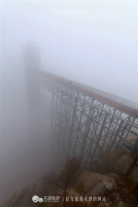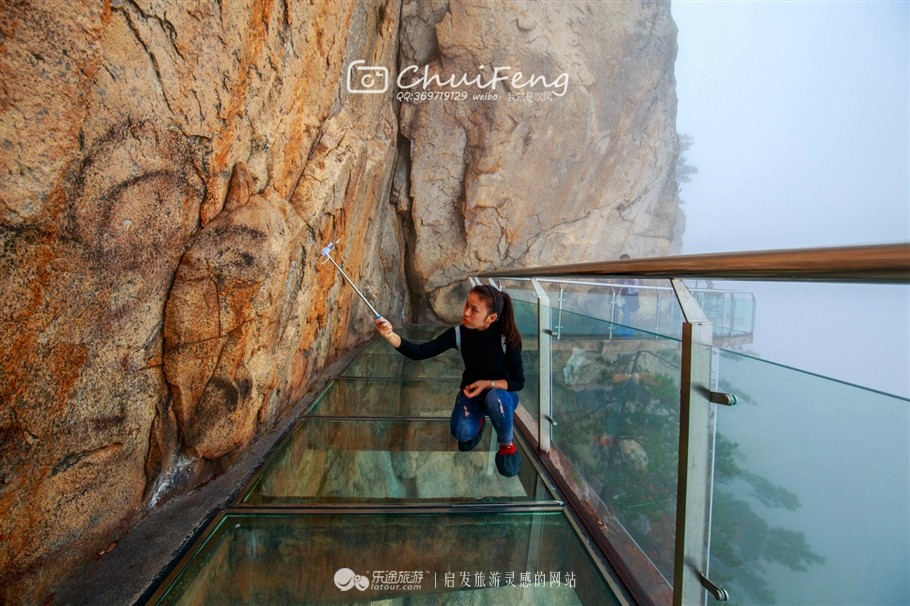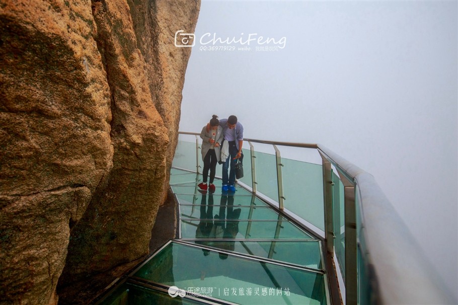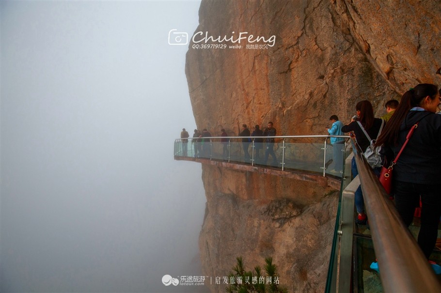 天气是越来越差,雾越来越大,位于小华山的玻璃栈道和垂直玻璃观光电梯,是刚刚开放的景点,玻璃栈道,建造在200米的绝壁之上,全长70多米,是全省第一,全国第四条玻璃栈道,胆小的人只敢扶壁而走。