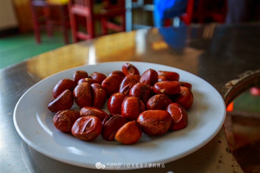 来到农户家里吃饭,农户拿出来罗田的特色三宝 :板栗,甜柿,茯苓。板栗果仁中含淀粉、蛋白质、脂肪、钙、磷、铁以及维生素A、B、C、、B2等物质.所含蛋白质比大米高30%,脂肪比大米高20倍,罗田的板栗更是比外地的板栗营养含量高,口感更粉,更甜。