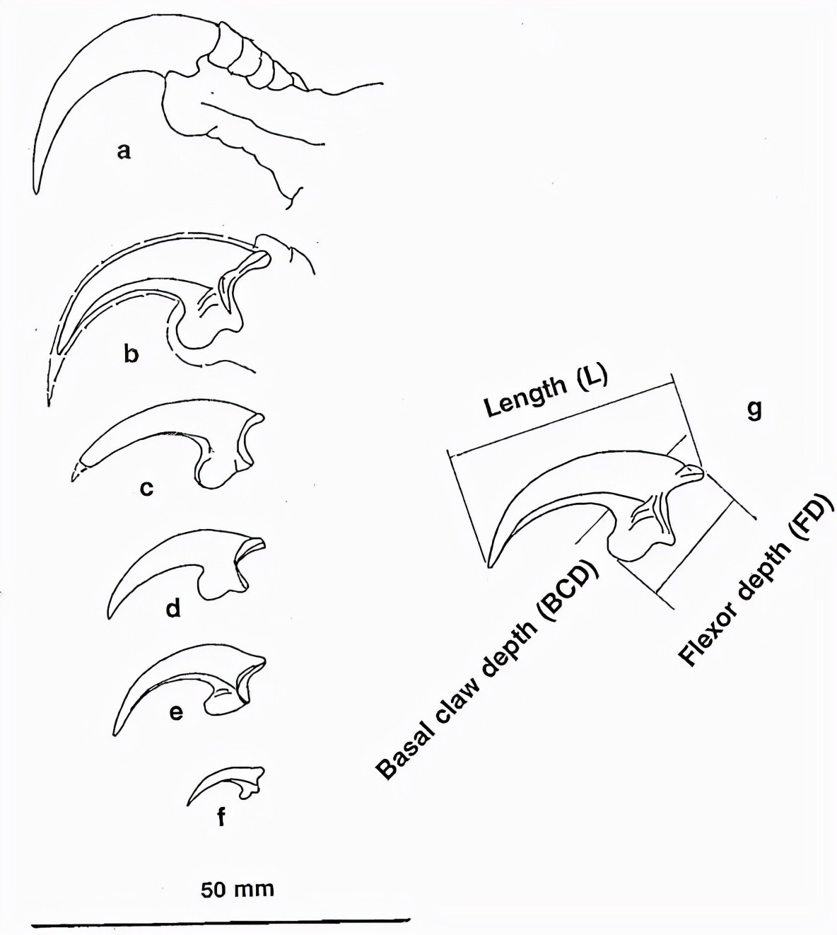 爪子的对比。从大到小分别是:摩氏隼雕、一种早全新世灭绝的大型鵟Buteogallus borrasi、黑猫警长里的著名角色食猿雕Pithecophaga jefferyi、楔尾雕Aquila audax、沼泽鹞Circus approximans | Richard N Holdaway / University of Canterbury (1991)