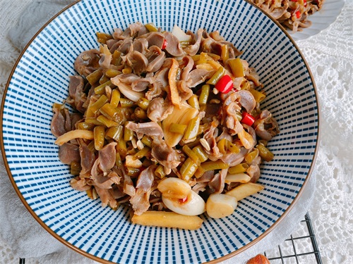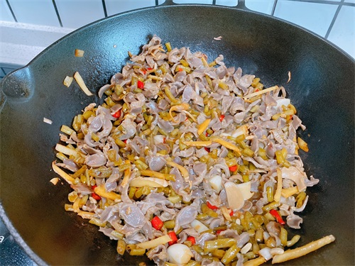 8、调料翻炒均匀就能出锅了,好吃下饭的酸豆角炒鸡胗就做好了,鸡胗脆嫩入味,豆角酸辣可口;