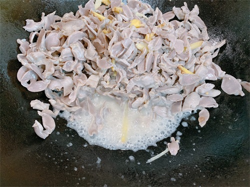 5、锅烧热,加入适量的食用油,把切好的鸡胗和一部分姜丝倒进去,大火爆炒,这个时候会炒出很多血水,这个血水腥味是很重的,千万不能要,翻炒出水之后把鸡胗捞出来放在盆中备用;