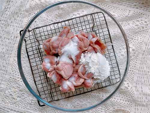 2、准备好的鸡胗中加入一勺食盐和一大勺淀粉,抓拌均匀,加食盐和淀粉能更好的去除鸡胗的腥味和鸡胗上的黏液,抓拌均匀之后,放在清水中清洗干净备用;
