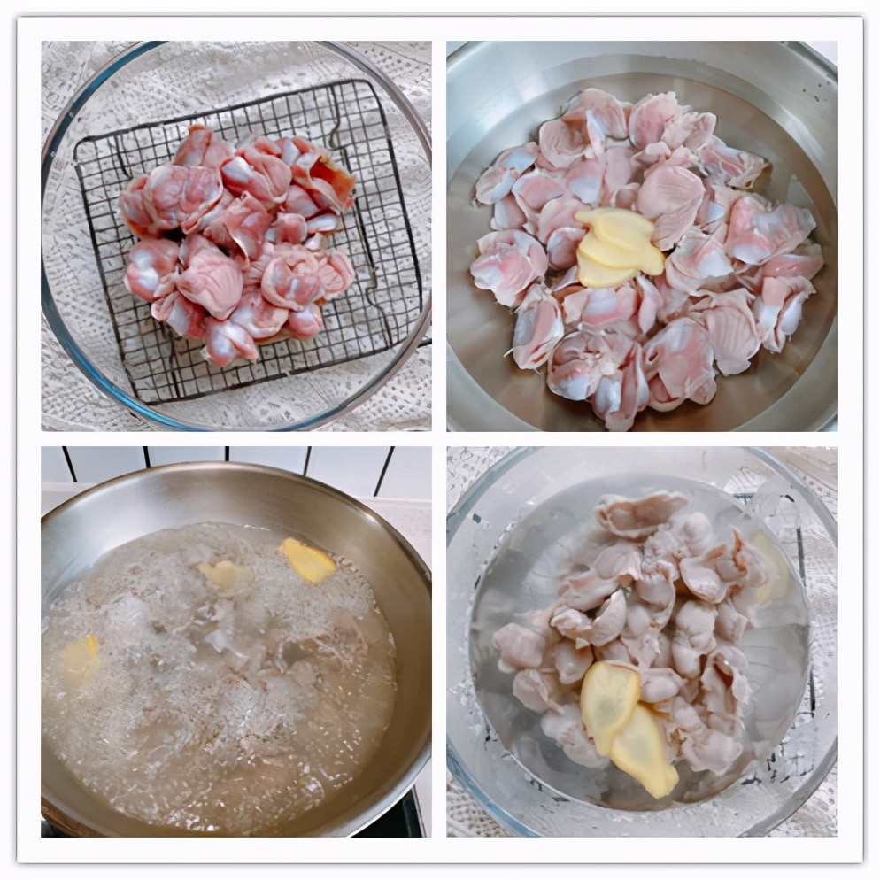 第2个技巧——焯水,鸡胗焯水要冷水下锅,不能热水下锅,冷水下锅能慢慢煮出鸡胗中的血水,去除一部分腥味;