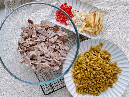 4、焯水后清洗干净的鸡胗,切成薄片,酸豆角切成小丁,再准备一些配料,配料能很好的去腥,多一点的姜丝、蒜末和小米辣椒圈;