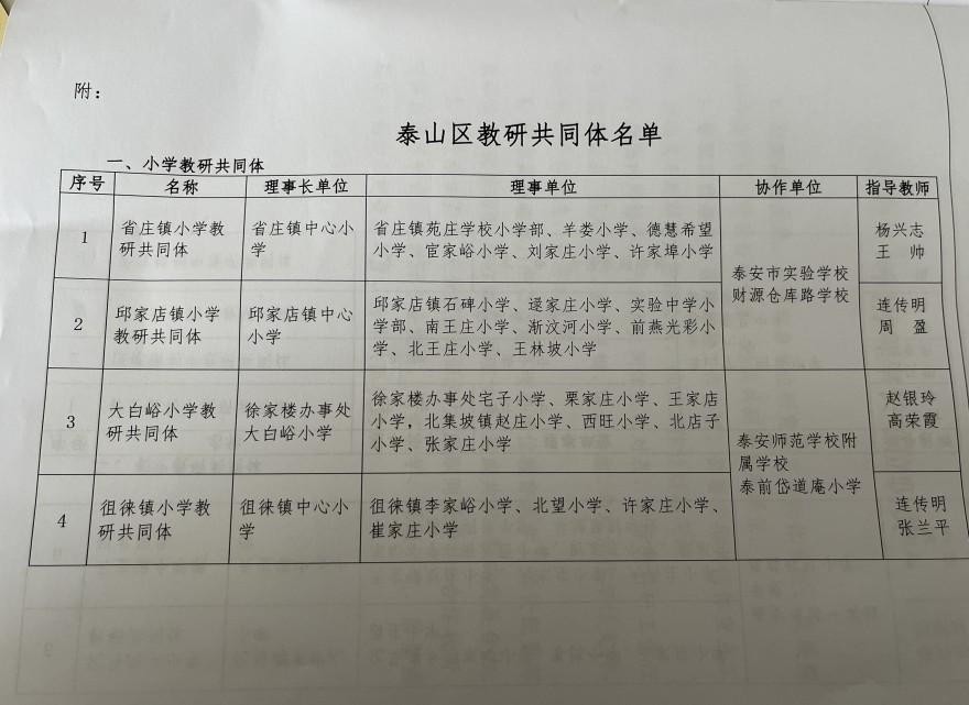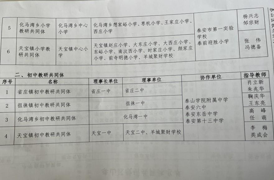 教研共同体是基于学习共同体成立的一种联合教研模式,以“同质促进、异质互补”原则,将根据共同体内各校特色和教师专业发展的需求,联合互动,共学共研,从而实现资源共享、相互借鉴、协同研究、共同发展。据了解,泰山区本次成立的教研共同体分别为省庄镇小学教研共同体、邱家店镇小学教研共同体、大白峪小学教研共同体、徂徕镇小学教研共同体、化马湾乡小学教研共同体、天宝镇小学教研共同体、省庄镇初中教研共同体、徂徕镇初中教研共同体、化马湾乡初中教研共同体、天宝镇初中教研共同体。