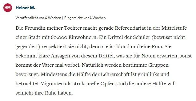 “我女儿的朋友在一个六万人口的城市任中学实习教师。那里有三分之一的学生不尊重她,因为她是金发女性。这些学生会直接告诉她,他们希望得到多少分,否则他们的父亲就会亲自找上门来。显然,某些群体得到了特别照顾。教师队伍中至少一半持绿左立场,将移民视为结构性的受害者。而另一半的教师则只是想要图个清静。”
