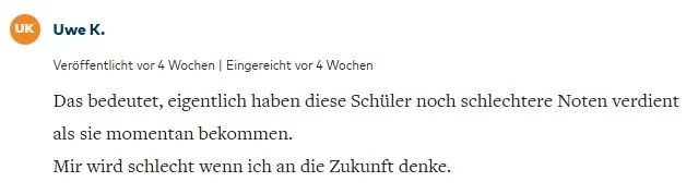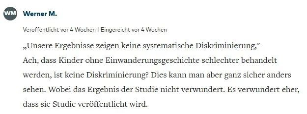 “文中说‘我们的研究结果没有显示出系统性的歧视’。呵呵,那么没有移民背景的孩子受到不好的对待就不算歧视吗?对此可完全可以有不同的看法。这项研究的结果并不让人感到意外,更让人惊讶的是这项研究竟然被公布了。”