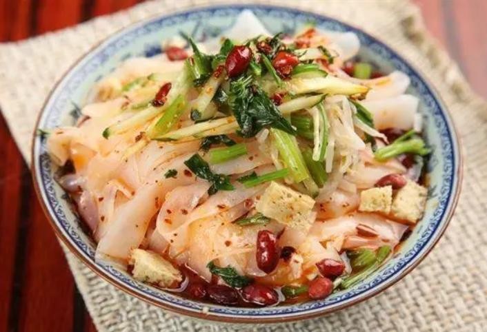 三、凉皮: 凉皮是西安夏季解暑的经典选择,制作时选用高筋面粉制作面团,擀成薄片后用开水烫熟,切成条状。配以各种凉拌料如黄豆芽、黄瓜丝、蒜泥、辣椒油等,最后淋上醋和酱油调味。凉皮口感爽滑,酸辣适口,是西安炎热夏季的清凉美食之一。