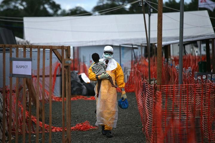 2014年,利比里亚,一位无国界医生的工作人员怀抱一名疑似感染埃博拉病毒的儿童。