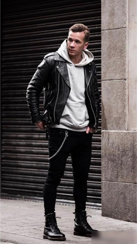 当然,除了这种传统的搭配方式之外,你还可以尝试更加个性的穿搭,短款夹克配上马丁靴,尽显利落英俊的男士风范, 搭配合身的白色T恤或者是衬衫,层次感十足,而且还能够凸显出年轻的气质,搭配上黑色的马丁靴,显得造型更加酷帅,全身的色调不超过三种,即便是这样简单的搭配也能够让你展现出满满的潮流感。