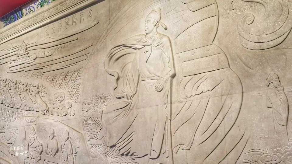 走进大厅,扑入眼帘的是一幅汉白玉浮雕——《时来风送滕王阁》。这是根据明朝冯梦龙所著《醒世恒言》中的名篇《马当神风送滕王阁》的故事而创作的。一层檐下有四块横匾,正东为“瑰伟绝特”九龙匾,内容选自韩愈的《新修滕王阁记》;正西为“下临无地”巨匾;南北的高低廊檐下分别为“襟江”、“带湖”二匾;西厅是阁中最大厅堂,西梁枋正中挂有白栋材同志书“西江第一楼”金匾。第二层正厅的墙壁上,是大型丙烯壁画《人杰图》,画高2.55米,长20余米。