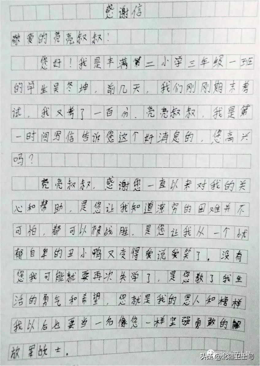 写信的人是申亮亮生前资助的困难学生,身患疾病的吴冬坤。申亮亮生前每月都会给冬坤资助一些钱财和物资,这无微不至的暖流展开了一个残疾孩子感恩奋进的求学路。冬坤经常说:“在我小时候,孤独无助与挫折苦难常伴我左右。而现在,亮亮叔叔总会浮现在眼前,告诉我时代是多么美好,我要努力读书、学习知识,将来一定有用武之地,我也可以体现出我的价值。”