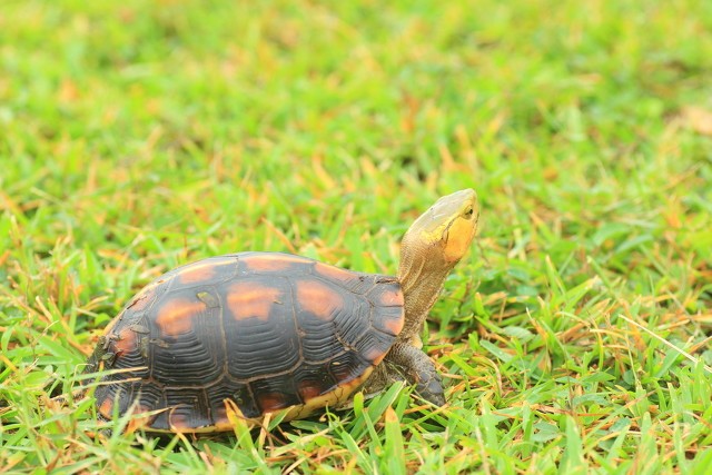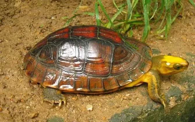 形态特征:体型中等。头背皮肤光滑,呈橄榄色,头背侧有金色细纹;吻短,不突出于喙缘。背甲长卵形,隆起较高,约为长的1/2。脊棱明显,颜色棕红,脊棱为黄褐色;椎盾5枚,肋盾4枚,猿盾12枚,有的后缘呈锯齿状。腹甲平,甲桥不明显,呈棕黑色,外缘与缘盾及背甲外侧缘为米黄色;腋盾、胯盾极小,肛盾1枚,中线上有一条不发达末段的沟缝。背、腹甲之间以韧带相连。胸、腹盾及相应的骨板间亦以韧带相连,腹甲前后两部均能向上关闭于背甲,因而得名。四肢偏扁,铅直前缘具覆瓦状大鳞;指、趾间微蹼;前5爪,后4抓。尾短。