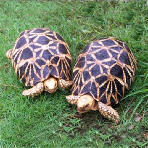 主要特征:背甲长300mm 左右,每块盾片上均有淡黄色放射状条纹。中央盾片中间有淡黄色六角形斑块,斑块左右均有对称淡黄色条纹。腹甲为淡黄色,有对称褐色斑块。头、颈、四肢淡黄色,布满大小不一的鳞片。前肢5爪,后肢4爪。
