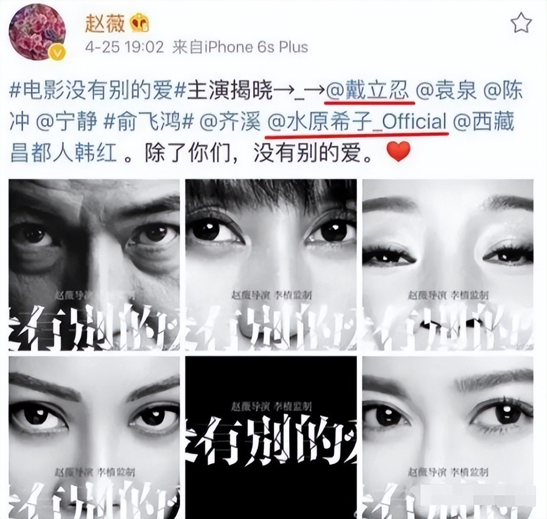 那就是2016年,赵薇作为导演拍了第二部影片《没有别的爱》,本来没人关注的,结果就因为她发布的演员表,引起轰动。