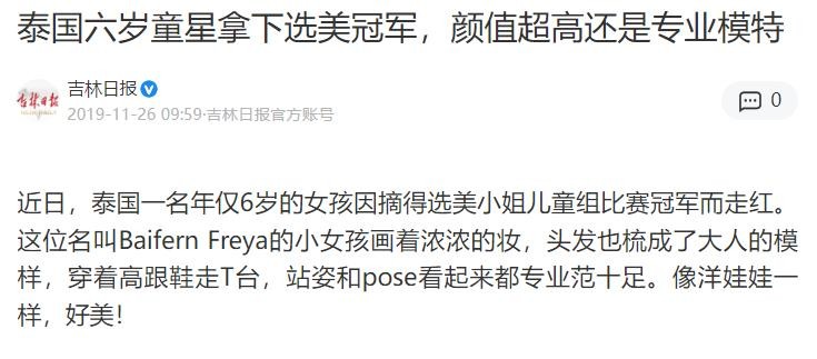 比起成人组的魔幻,泰国儿童选美才是真·硬核,2019年,6岁的Baifern Freya画着烟熏妆、踩着恨天高夺得儿童组冠军,被网友吐槽“26岁的灵魂塞进6岁的身体”。