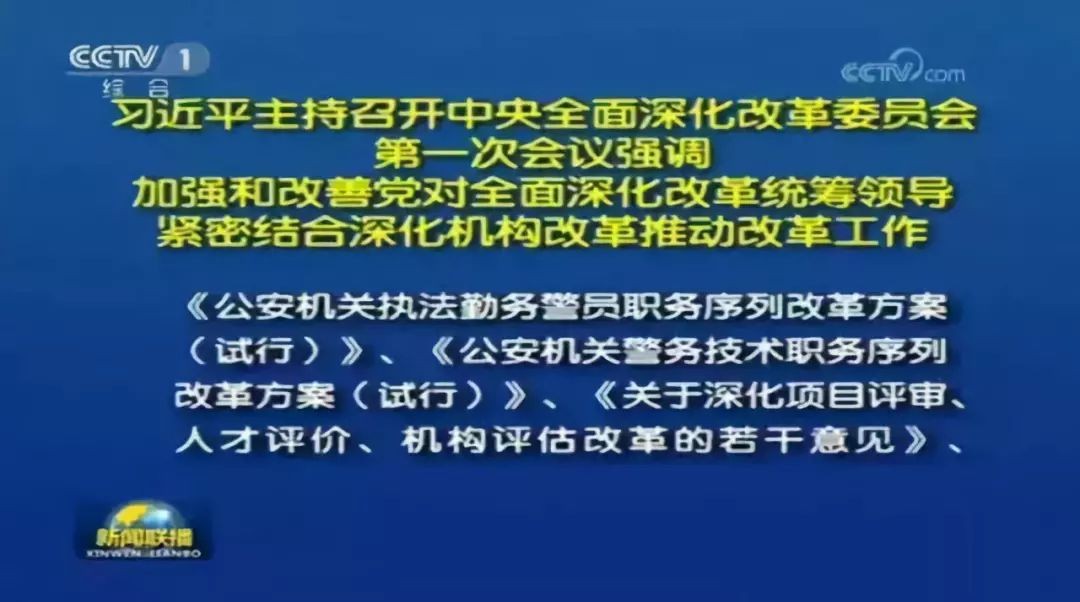 中央全面深化改革委员会第一次会议审议通过了《公安机关执法勤务警员职务序列改革方案(试行)》、《公安机关警务技术职务序列改革方案(试行)》等文件。