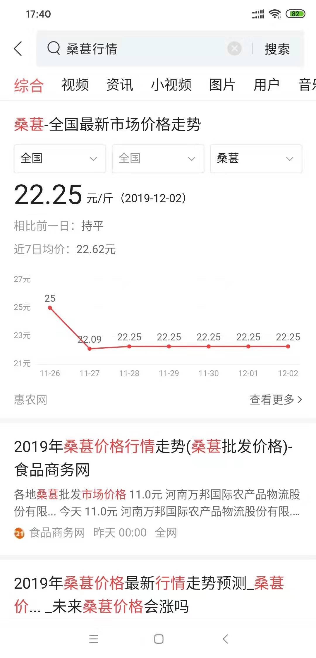 看完这篇文章,你是不是想了解桑葚的行情呢?想知道种桑葚是不是有前景?其实你可以用今日头条app上方的搜索框输入“桑葚行情”,就可以看到桑葚的价格和行情分析了。如下图: