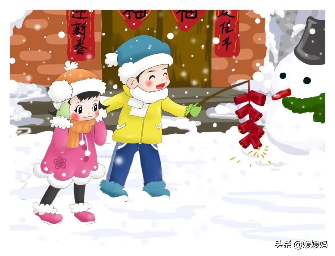 春节到了,家家户户都贴上了大红色的春联,到处是一片喜气洋洋的景象。房屋、地面都覆盖着厚厚的雪,门前还还堆着一个可爱的雪人。你看,小红和小黄正在空地上放鞭炮,小红害怕得用双手捂住了耳朵,小黄勇敢地点燃了手里的鞭炮,还调皮地吐了吐舌头。鞭炮的引线一下子就被火苗吃掉了,一阵“噼里啪啦”的响声过后,鞭炮变成了一地的红纸屑。鞭炮放完了,他们一起到广场上看表演。春节真是一个美好的节日!