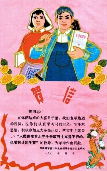 (29)1970年代,湖南凤凰县革命委员会计划生育领导小组办公室发给新婚夫妇的贺信。祝贺内容:认真学习马列主义毛泽东思想,积极参加三大革命运动,落实毛主席关于:“人类在生育上完全无政府主义是不行的,也要有计划生育”的教导,为革命做出贡献。