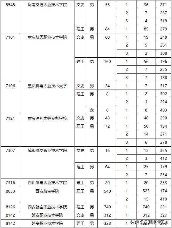 院校中最高分和最低分都在300分以上,分数相差不大,高一点的是成都航空职业技术学院,低一点的是重庆航天职业技术学院。