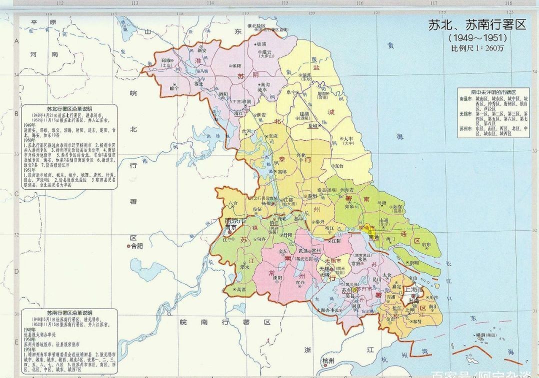 再说说苏北,1949年4月21日设立苏北行署区,行署驻泰州市。苏北行署区辖5个专区(扬州、泰州、南通、盐城、淮阴5专区)、3个县级市(扬州、泰州、南通)、35个县,包括今天的苏中苏北大部分地区。当时的苏北不包括连云港和徐州的,宿迁那个时候还不存在,当下宿迁的泗洪县还隶属于安徽省。