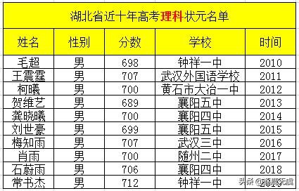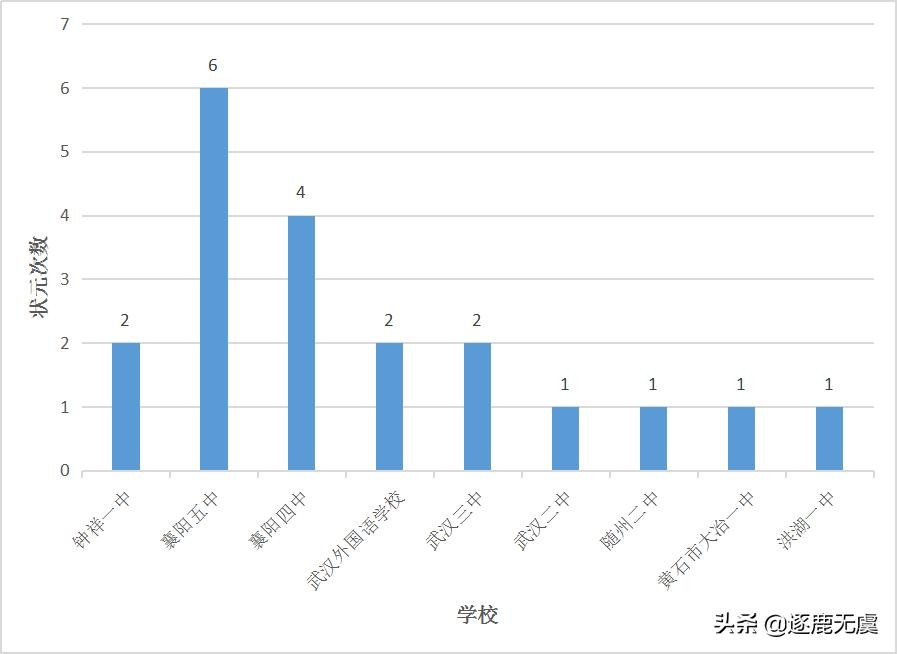 上图可以看出,湖北各个地区高考实力差别很大,其中襄阳五中和襄阳四中分别拿到6次和4次的省状元,占到近十年状元总数的一半,可见实力之强。钟祥一中、武汉三中、武汉外国语学校各拿到2次省状元,武汉二中、随州二中、黄石市大冶一中、洪湖一中各拿到1次省状元。