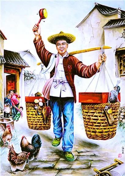 上了点年纪的人应该都会记得:上世纪七,八十年代,每当农闲季节,总会有一批人肩挑货郎担,手拿拔浪鼓,口中喊着鸡毛换糖,走街串巷。他们货郎担中装着些针头线脑和姜糖红糖等小商品,换取农户家中的鸡毛鸭毛,获取微利。换来的鸡毛一开始用于“塞秧脚”当作肥料,后来加工一成鸡毛掉子等各式小商品。