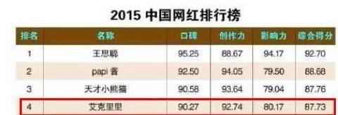 今年《互联网周刊》发布了一份 “2015年中国网红排行榜” 榜单主要依据各位“网红”在社交媒体的口碑、创作力、影响力进行综合排名,而我们的里里小公举名列第四位呢,可见他有多火。