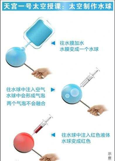 王亚平一个金属圈插入饮用水袋并抽出后,形成了一个水膜。这在地面,难以实现,因为重力会将水膜四分五裂。那么,这个水膜结实吗?轻晃金属圈,水膜并未破裂,而是甩出了一个小水滴。再往水膜表面贴上一片画有中国结图案的塑料片,水膜依然完好。更奇迹的时刻:在第二个水膜上,用饮水袋不断注水,水膜很快长成一个晶莹剔透的大水球。水球内有连串的气泡,用针筒取出,水球却不受任何破坏。最后,王亚平注入红色液体,红色慢慢扩散,水球变成了一枚美丽的“红宝石”。