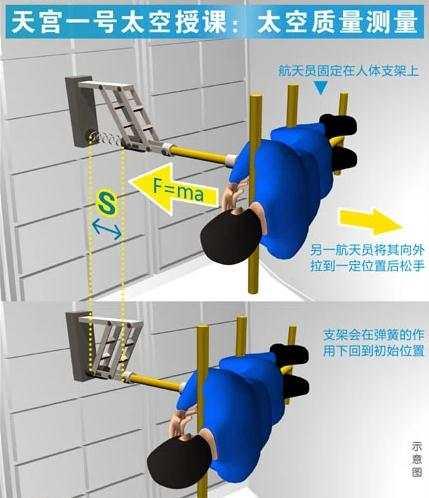 在失重的太空,地面的测重不再奏效。在神州十号,有一样专门的“质量测量仪”。“太空授课”的助教聂海胜将自己固定在支架一端,王亚平将连接运动机构的弹簧拉到指定位置。松手后,拉力使弹簧回到初始位置。这样,就测出了聂海胜的质量——74千克。