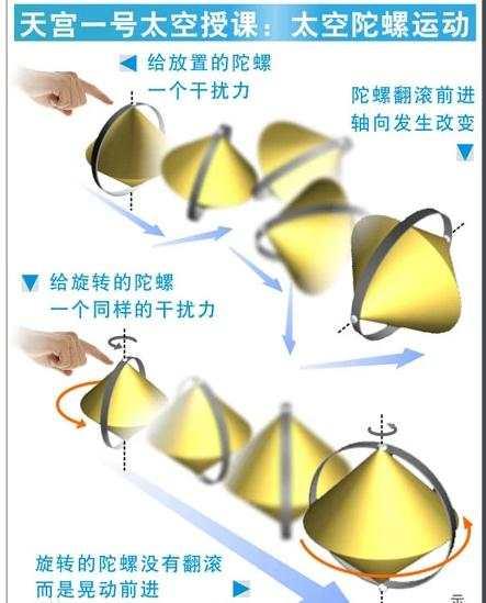 王亚平取出一个陀螺,用手轻推,陀螺竟然翻滚着向前,行进路线变幻莫测。随后,她又取出一个陀螺,抽动它后,再用手轻推,陀螺沿着固定的轴向向前飞去。这就要关注到“角动量守恒”这个知识点。