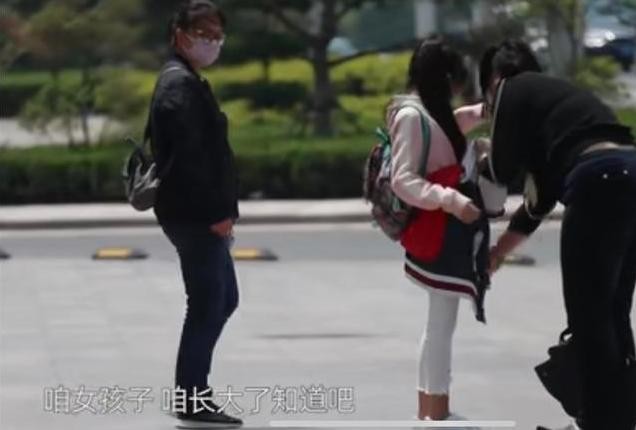 正巧这时,路边的一位阿姨发现了这个情况,她走向女孩用衣服系在了女孩的腰间,此时女孩也发现了异常,因为是突发情况,女孩显得非常的惊慌,并且满脸的害怕,阿姨并没有走,她像妈妈一样,安慰了女孩,并且耐心的给女孩讲解了,为什么她的身体会发生异样,并细心地叮嘱了回家后该干什么,最后女孩被有一位好心人送回了家。