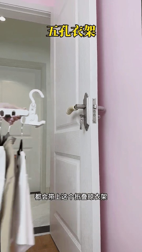 六、折叠晾衣架,出差旅行住酒店都会带上这个折叠晾衣架,这里是对着固定的,不管是门把手上、椅子的背上、柜门上、抽屉上,还有住在宿舍不方便晾衣服的都可以用它挂,一次可以挂五件衣服,中间都是有分隔的,不会挤在一块,这样更容易晾干,这个挂钩的位置是可以旋转的,这样的柜门把手也能挂,不用的时候折叠起来也不占空间。