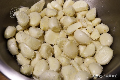 5、把处理好的蒜放进盆里,加入小半勺盐,再加入2勺白糖。