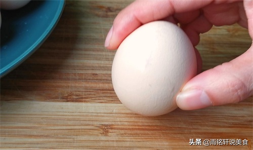 第三步:取一个鸡蛋,鸡蛋的大头的一面放案板上轻轻地磕破,这样有利于入味。鸡蛋大头的地方是气室,里面有一层膜,所以鸡蛋磕破蛋液也不会流出来。
