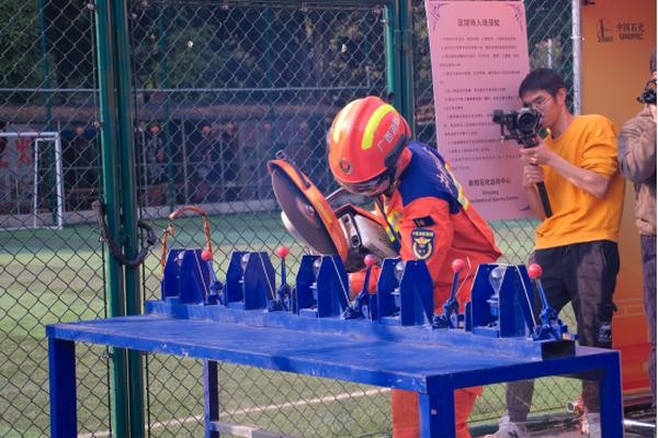 消防战士现场演示消防器材的使用。(黄何清韵 摄)