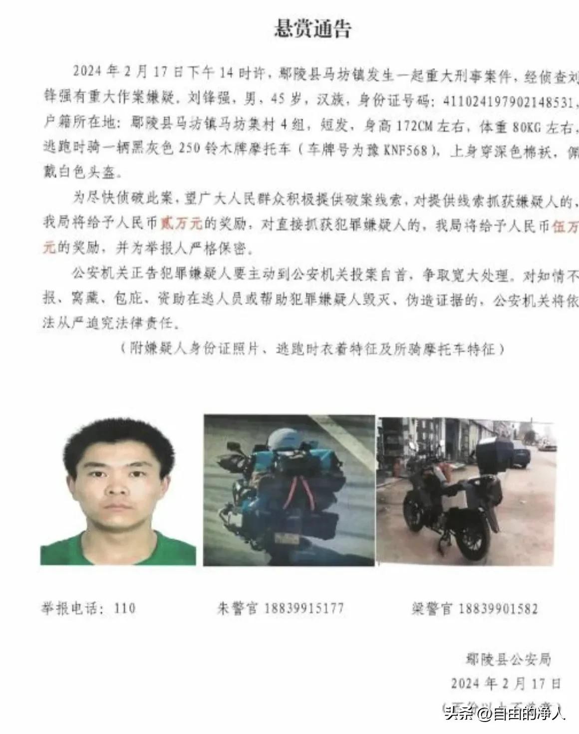 犯罪嫌疑人刘峰强出生于1979年2月14日,2024年2月17日对受害人家纵火砍伤多人后逃匿,当天当地警方发布悬赏通告,通告称:对于提供线索抓到嫌疑人的奖励2万元人民币,对于抓获犯罪嫌疑人的奖励5万元人民币。
