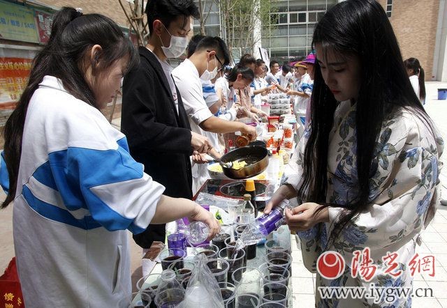 “阿姨,买一份我们的甜点吧!”“快快快,把展台放好,下锅,水都沸腾了!”“赶紧出来一个人负责推销”……学生们不仅要做出美味的食物,还要想尽办法卖出去。他们手上的活儿不停,互相之间还不断进行交流。