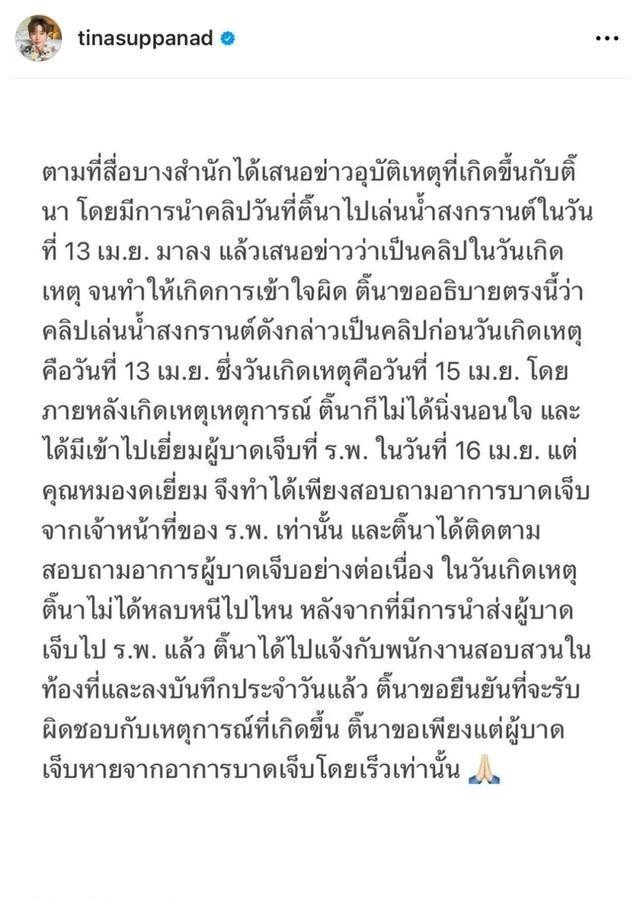 李缇娜在社交媒体上回应了这件事,她解释了事发前后自己的动向。她说,她当天是和朋友一起去参加电音节,她没有喝酒,也没有吸毒,她是在清醒的状态下开车的。她说,她在开车时,突然看到一名男子从路边冲出来,她来不及刹车,就撞上了对方。她说,她当时很惊慌,但她没有逃跑,而是立刻下车,拨打了120和110,等待救护车和警察的到来。她说,她在现场一直等到了警察的调查结束,她也主动提供了自己的驾驶证和身份证,接受了酒精测试和尿检,证明自己没有酒驾和毒驾。